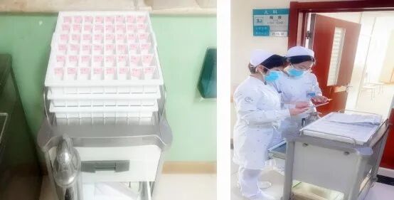 科室為落實優(yōu)質(zhì)護(hù)理,購置了擺藥盤,按床號姓名擺藥,方便了治療班工作,也規(guī)范了口服藥擺放流程。現(xiàn)口服藥發(fā)放為雙人推車,認(rèn)真落實身份識別及查對制度,為患兒提供熱水,看服到口,保證患兒用藥安全。